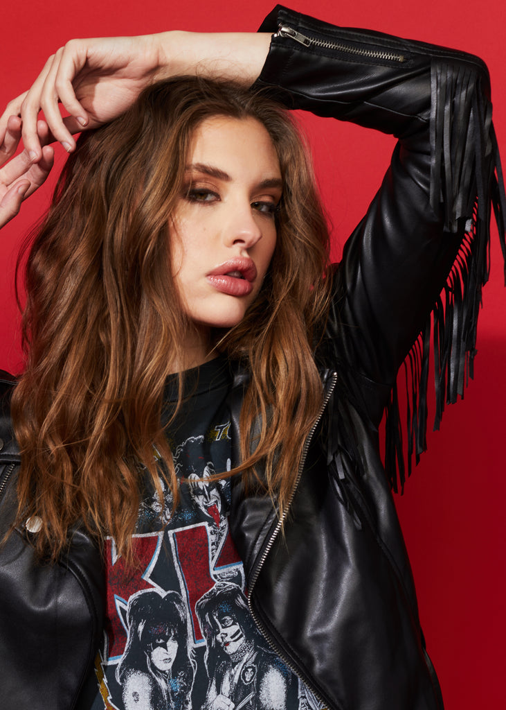 Modern, vielseitig und cool: Die Lederimitatjacke überzeugt auf den ersten Blick. Einen enormen Style-Faktor erhält das Key-Piece dank der raffinierten Fransen auf der Vorder-und Rückseite, die der Kurzjacke ein Western Flair verleihen.