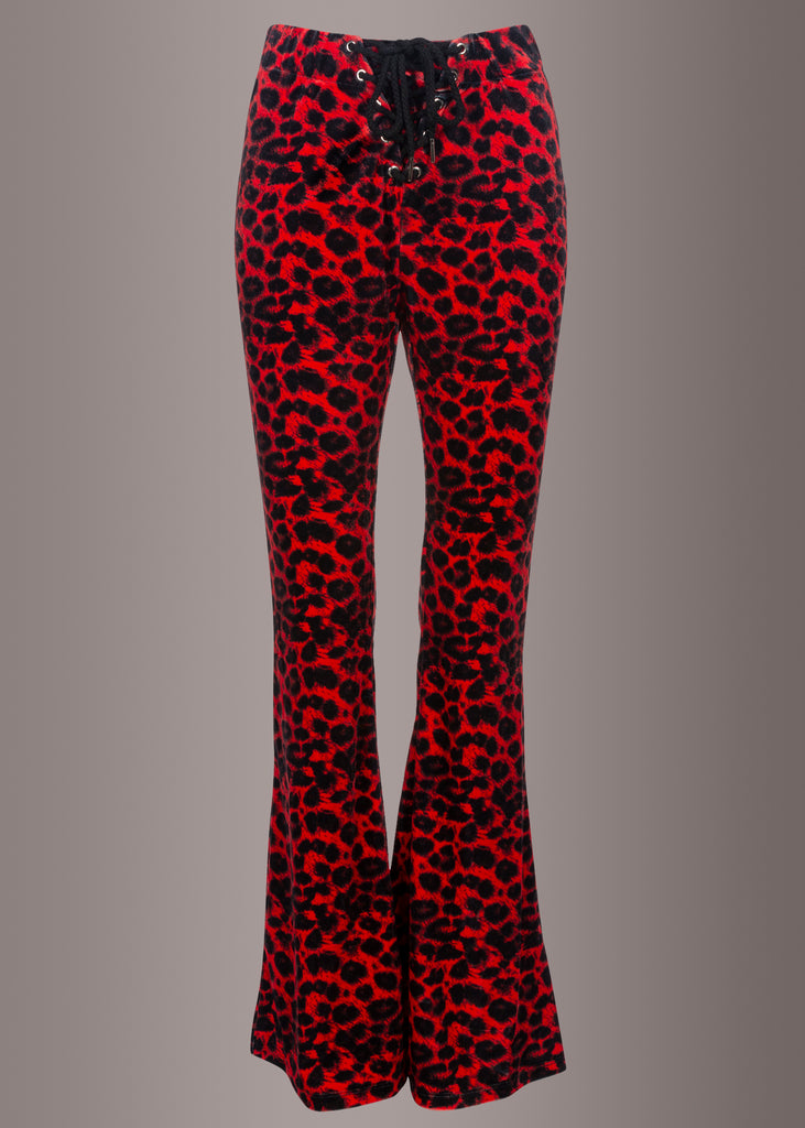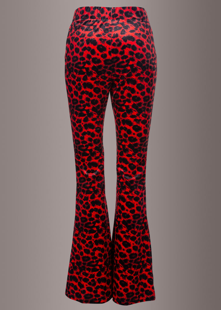 Die Schlaghose aus softem roten Samtstoff ist in einem tollen Leopardenmuster gefertigt und alles andere als basic!