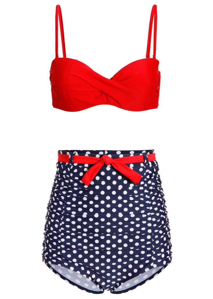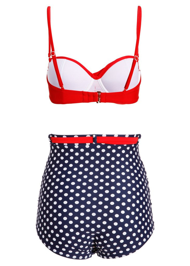 Dieser zweiteilige Bikini versprüht Retro Flair und ist der passende Begleiter für entspannte Urlaubstage! Die dunkelblau gepunktete Hose dieses wunderschönen Bikinis hat eine hohe Taille, die sehr schmeichelnd für die Figur ist. Die Hose hat zudem einen schönen roten Gürtel, der abnehmbar ist. Das rote Bikini Oberteil macht das Ensemble perfekt und ist leicht gepolstert.