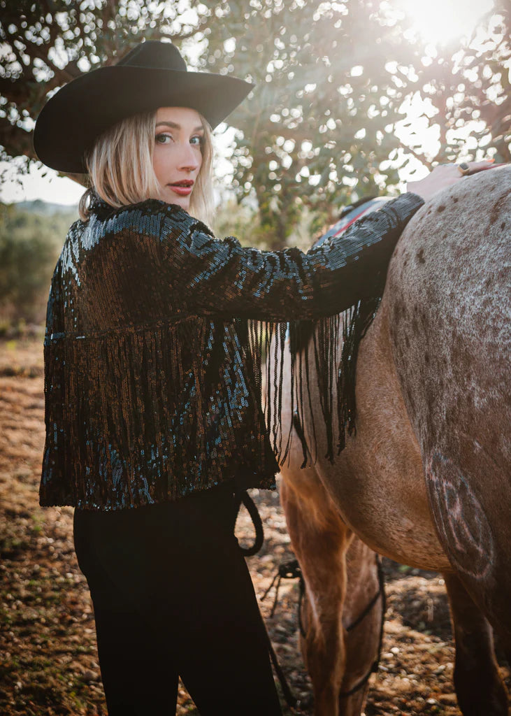 Coastal Cowgirl Pailletten-Jacke in Schwarz mit Fransen
