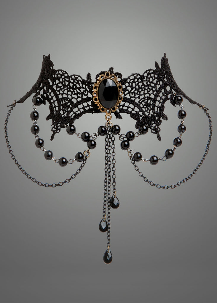 Elegante viktorianische Perlen Gothik Burlesque Steampunk Vintage Choker Kette aus schwarzer Spitze.