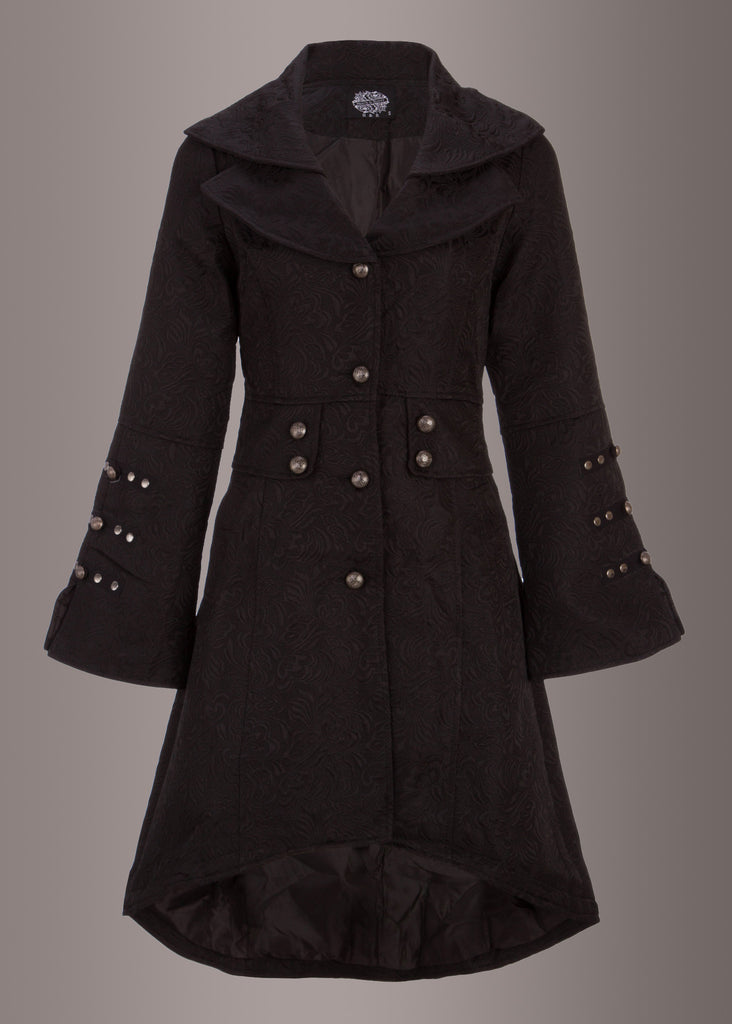 Eleganter schwarzer viktorianischer Gothik Mantel Jacke mit Schnürung und Verzierungen. Der in Gothik Miltäroptik von Hearts & Roses ist ein zeitloses Kleidungsstück, das zu fast allen Looks passt.