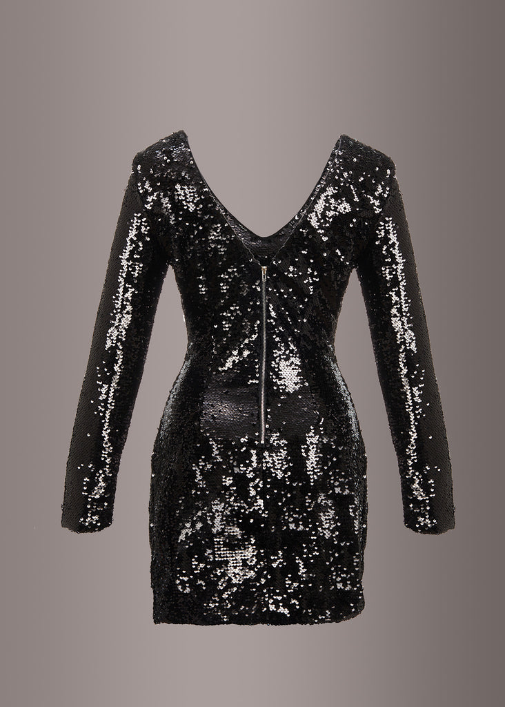 Zum Ausgehen und für festliche Anlässe ist dieses Kleid die perfekte Wahl. Die funkelnden schwarzen Pailletten, die das Kleid über und über schmücken, machen es zu einem wunderschönen Blickfang und verleihen dem Modell eine glamouröse Note. Die taillierte Passform des Kleides umspielt gekonnt die weibliche Silhouette. Das Kleid hat lange Ärmel und einen tiefen V-Auschnitt an der Vorder- und an der Rückseite. Ein Innenfutter und ein Reißverschluß im Rücken vollenden das traumhaft schöne Kleid.