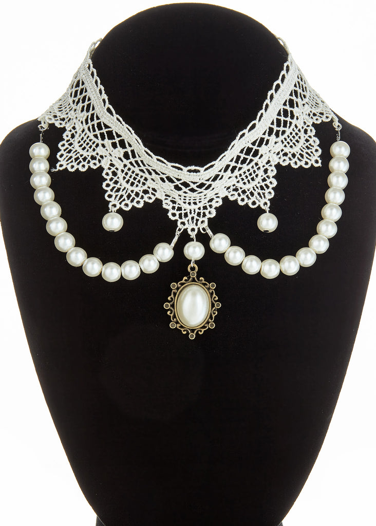 Elegante viktorianische Brautschmuck Gothik Burlesque Vintage Choker Kette aus weißer Spitze und mit weißen Perlen.