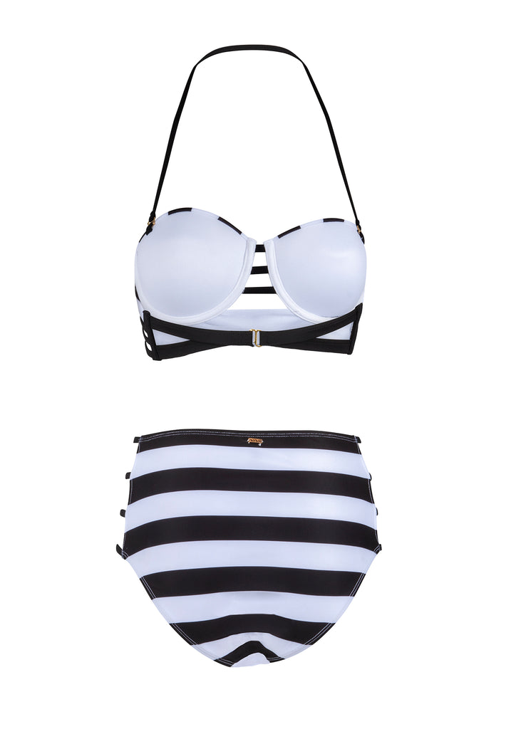 Fashionistas aufgepasst: Dieser modische, schwarz-weiß gestreifte Bikini ist ein It-Piece für Strand, Badesee und Freibad und wird garantiert zu Ihrem neuen Lieblingsstück. Die gefütterte blaue Hose dieses wunderschönen Bikinis hat eine hohe Taille, die sehr schmeichelnd für die Figur ist. Raffinierte Ausschnitte entlang der Bikinihose lassen stilvoll etwas Haut durchblitzen. Das passende Bikini Oberteil hat vorgeformte Cups und verstellbare Träger. Das bequeme Modell ist rückseitig mit einem Klickverschluss schließbar.