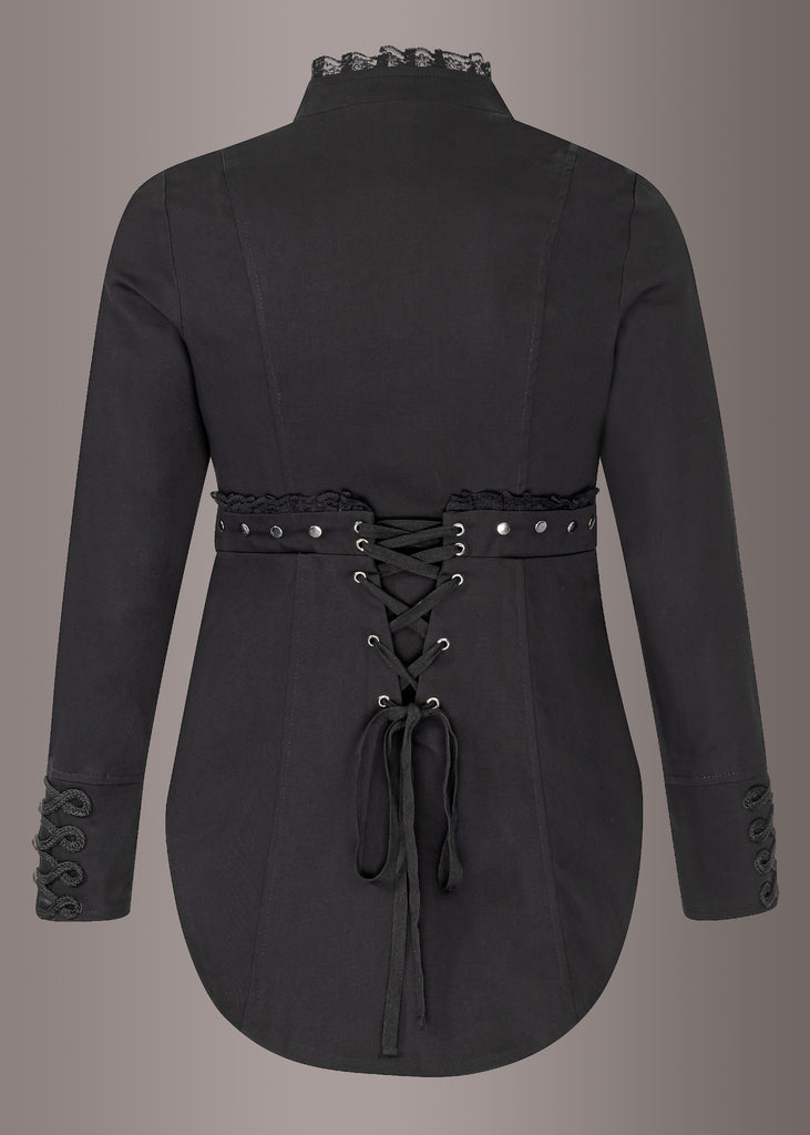 Diese wunderschöne Gothic Jacke wird zweifellos neidvolle Blicke auf Sie lenken. Die coole schwarze Jacke im Military Style fällt schon allein durch die vielen aufwendig verzierten silberfarbenen Knöpfe ins Auge die sowohl als Verschluß sowie als Verzierung entlang der Ärmel dienen. Die Jacke ist figurbetont geschnitten und zaubert eine schöne weibliche Silhouette. Der raffinierte Stehkragen mit Spitzendetails macht den tollen Look perfekt. Auf der Vorderseite ist die Jacke bis zur Hüfte und an der Rückseite länger geschnitten, was der Jacke so den typtischen Frack Look verleiht. Das Material begeistert auf Anhieb durch seine weiche Griffigkeit und hochwertige Qualität.