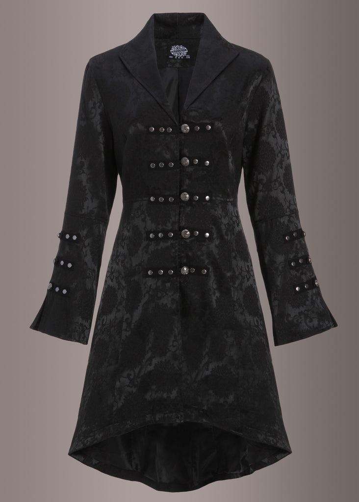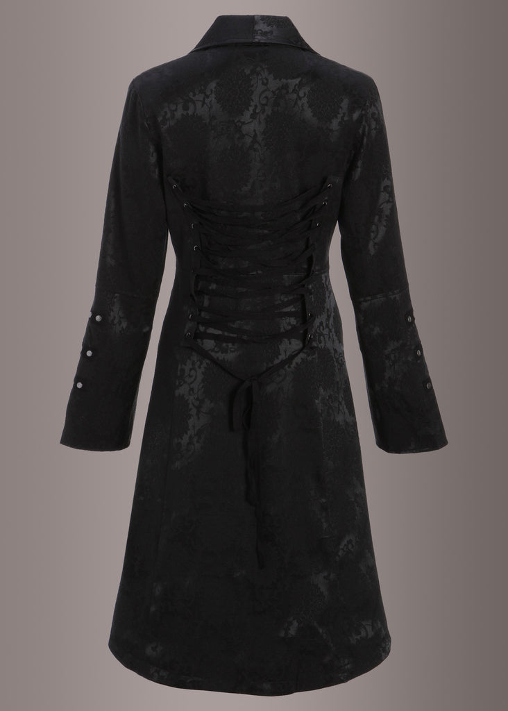 Ein atemberaubender Mantel im viktorianischen Design! Der leichte Mantel ist aus einem wunderschönen schwarzen Stoff in einem floralen Brokat-Muster gefertigt und hat einen figurbetonten Schnitt. Besonders hübsch sind die aufwändig gearbeiteten Knöpfe, welche als Verschluss und als Verzierung an den Ärmeln dienen. Am Rücken befindet sich eine hübsche Schnürung, durch die sich die Taille je nach Lust oder Anlass mal stärker oder schwächer hervorheben lässt.
